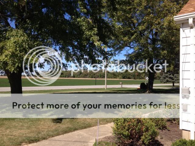 And I took this Friday when I was outside at Mom/Dads, talking to my Dad. It's hard to tell in the pic, but the woods in the background is starting to turn & it just looked beautiful from where I was standing! The sky was so blue! This use to be my Grandpa/Grandma's woods - it sold when they sold the farm my Mom grew up in! I spent a lot of time in this woods when I was little!! : -)