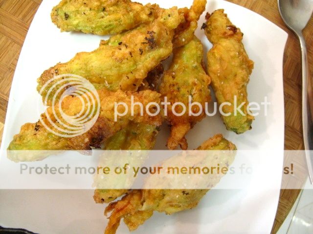 Well in keeping with tonight's blossom theme here at the Pines, Carl is serving up deep fried squash blossoms stuffed with sweetened ricotta cheese. They are pretty darn good!!!